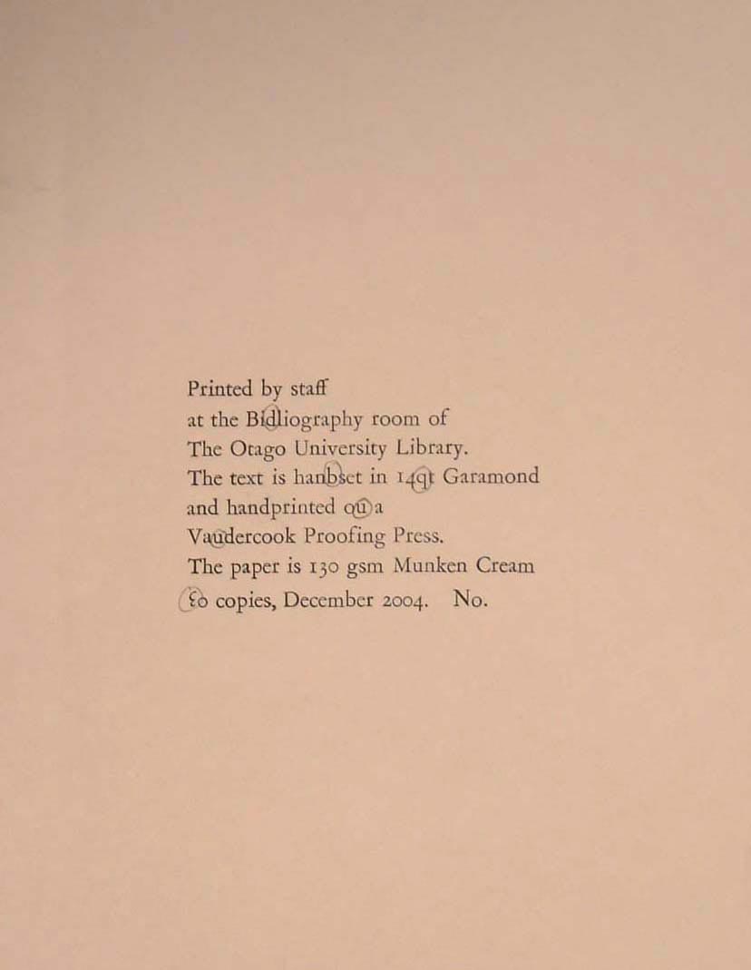 In December 2004, University Library staff under the leadership of Dinah Dunavan, the daughter of Llewelyn Richards, a Wellington-based hand-craft printer, printed a recipe book. As usual, for those inexperienced in setting type, there were occasional errors, albeit small ones. Because there was no sample ‘long s’, a decision was made to use an ‘f’ for the title: Refipe. Someone had suggested chipping off the cross bar extensions on an ‘f’, as earlier printers would have done, but this was deemed unacceptable. Thirty copies were printed. University of Otago Library Staff, Refipe Book. Dunedin: Bibliography Room, University of Otago, 2004 |