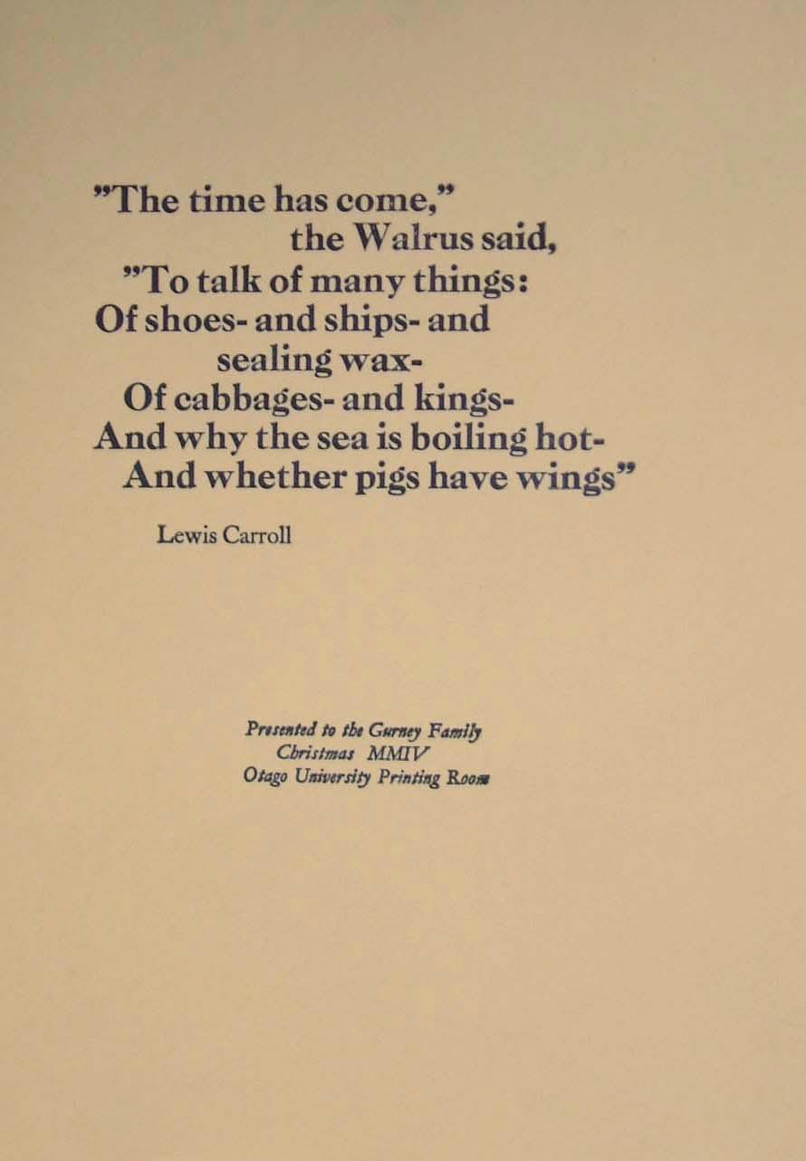 The following year, Shelley Gurney printed on hand-made paper a keepsake, an extract from Lewis Carroll’s The Walrus and the Carpenter, using 18-point Caslon Heavy for the body of the text. Lewis Carroll, extract from The Walrus and the Carpenter presented to the Gurney Family, 2004 |