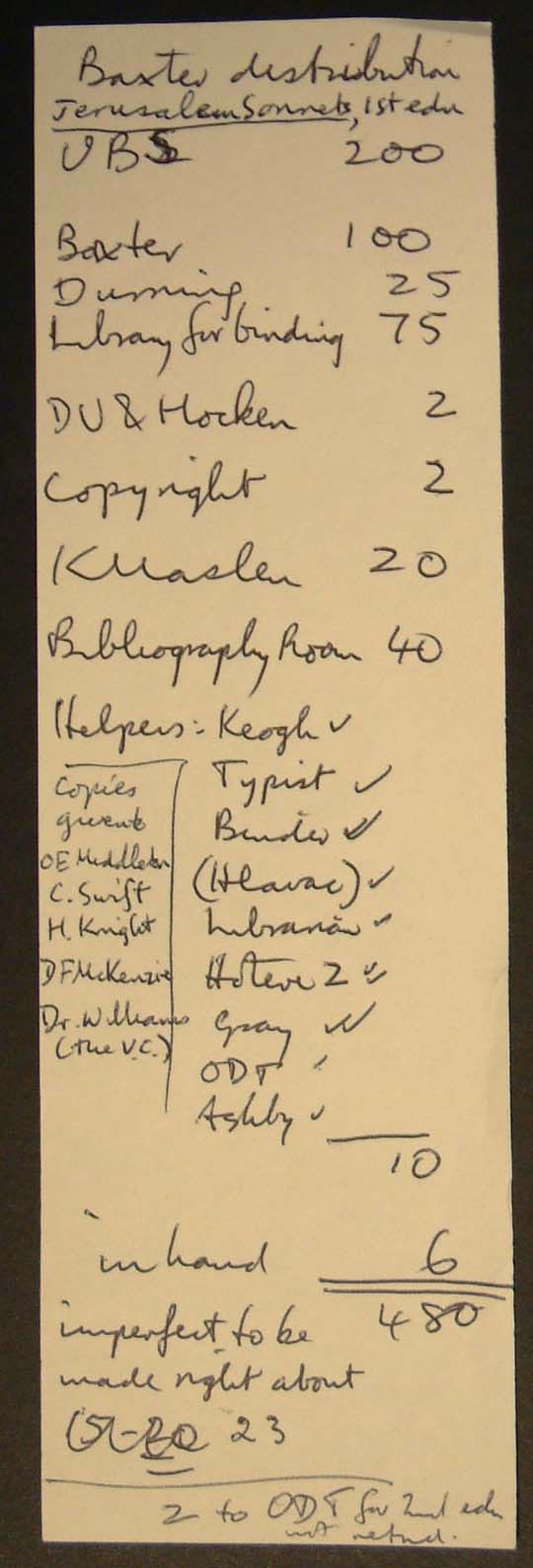 This is a hand-written receipt by Baxter for royalties received and the ever-present distribution list for Jerusalem Sonnets.