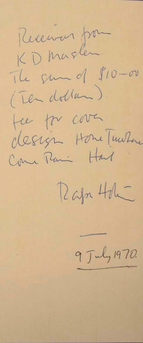 Hone Tuwhare’s Come Rain Hail (1970) was another publication that was jobbed out, yet carried the Bibliography Room imprint. The entire text was set on an IBM Selectric typewriter and printed offset at the University Registry. Ralph Hotere was again asked to do the cover; his charge - $10.00. Tuwhare’s response to the artist’s wizardry in creating ‘a superb orange circle on a purple thought-base’ is recorded in Hotere, a poem from the collection. The 1,000 card covers, creased in four places, cost $57.20 and were printed by the local firm of Coulls Somerville Wilkie Ltd. Also on display are receipts signed by Tuwhare and Hotere acknowledging payments received. Receipt from Ralph Hotere to Keith Maslen, 9 July 1970 |