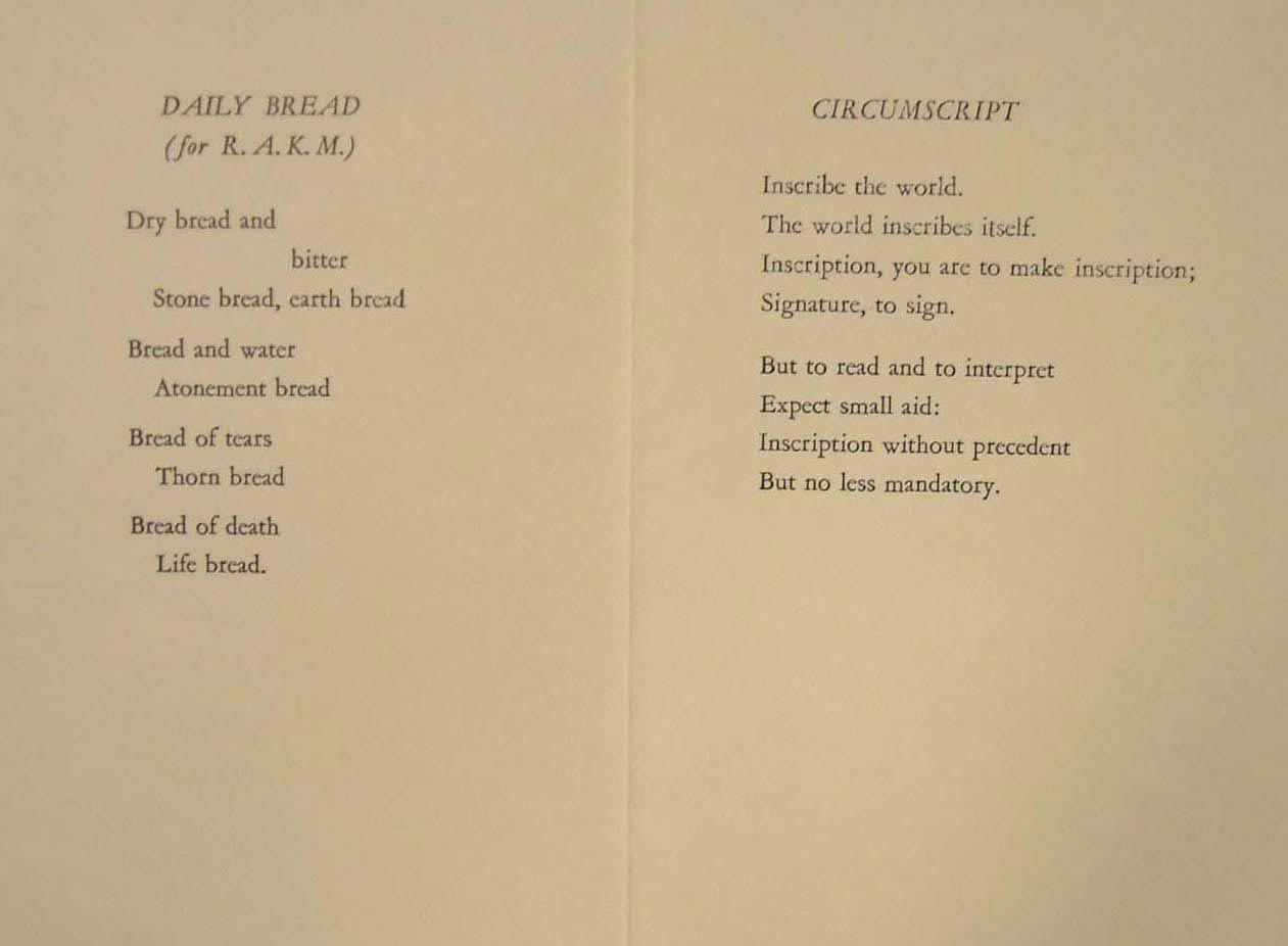 When Dr Maslen was on sabbatical leave, the presses were left in the capable hands of Dr Roger Collins, of the French and Art History Departments. ‘L’Epitaphe Villon’ was printed by Collins in 1964. The title La Ballad des Pendus (not seen but overleaf) is printed in a rather striking red. Charles Brasch, poet, patron and literary editor, also got ink on his hands; setting and printing the poems ‘Daily Bread’ (for Ron Mason) and ‘Circumscript.’ ‘Daily Bread (for R. A. K. M)’ and ‘Circumscript’, printed by Charles Brasch, 1964 |