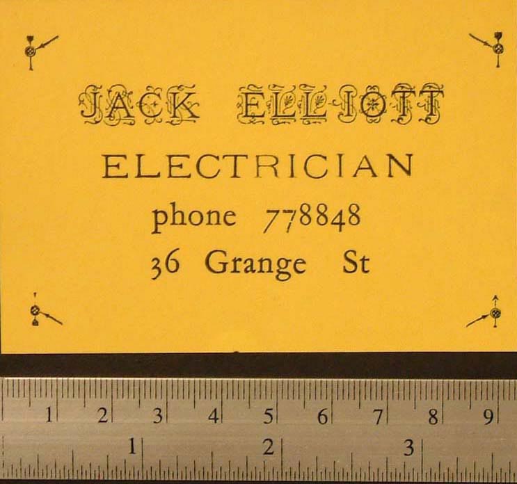 Jack Elliott’s yellow business card and Gavin Shaw’s simple but effective ‘Super 8’ membership ticket were two small jobs printed in the Bibliography Room. However, most of the printing continued to be done by English students, who were either interested in gaining more skills at setting type, or fulfilling assignment requirements in the Bibliography course. As can be seen from W. H. Auden’s ‘The Three Companions’, errors can easily be made when setting type. ‘Jack Elliott', Electrician, 1985 |