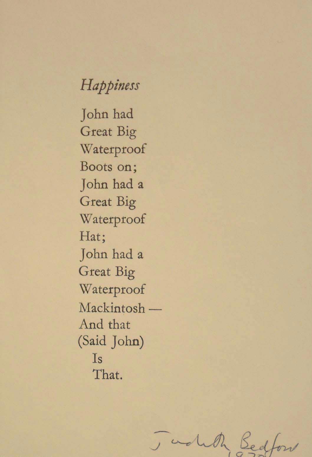 Other more ephemeral pieces appeared over the years, including A. A. Milne’s ‘Happiness’ poem and the rather delightful ‘Clocks cannot tell the time of day.’ The library profession was not forgotten: the J. W. Reynolds loan label was printed by Dr Maslen, Susan Irvine (ex- archivist at the Hocken), and Maud Cahill, now owner-operator of Jason’s Books in Auckland. A. A. Milne, ‘Happiness’, printed by Judith Bedford, 1970 |