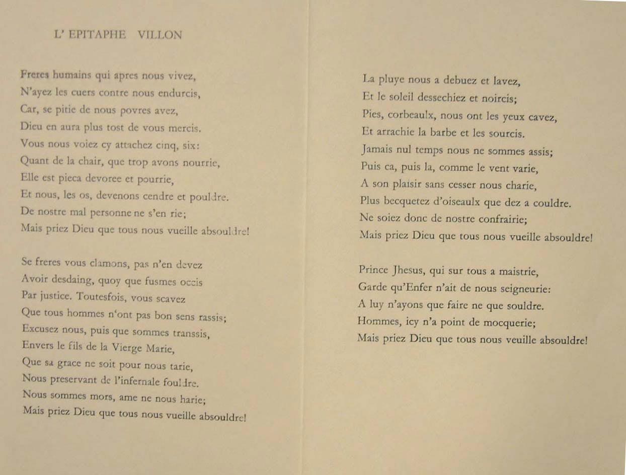 When Dr Maslen was on sabbatical leave, the presses were left in the capable hands of Dr Roger Collins, of the French and Art History Departments. ‘L’Epitaphe Villon’ was printed by Collins in 1964. The title La Ballad des Pendus (not seen but overleaf) is printed in a rather striking red. Charles Brasch, poet, patron and literary editor, also got ink on his hands; setting and printing the poems ‘Daily Bread’ (for Ron Mason) and ‘Circumscript.’ François Villion, ‘L’Epitaphe Villon’, printed by Roger Collins, 1964 |