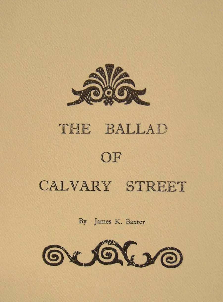 When Dr Maslen retired in 1991, his replacement in the English Department was Dr Shef Rogers, who took over the Methods and Techniques paper. He and his students continue to use the Bibliography Room, producing hand-set printing exercises. Perhaps because students will always be students, there is a sense of joyous anarchy in some of the results. They range from the amusing ‘Lest we forget’ with favourite characters, pet peeves and ambitions listed to the oppressed ‘Students of Purgatory 468’ with their A Theory Tale – in this instance a badly inked copy off the Columbian Press, where evenness of impression is hard to achieve. James K. Baxter, The Ballad of Calvary Street. Dunedin: Bibliography Room, University of Otago, 2004 |