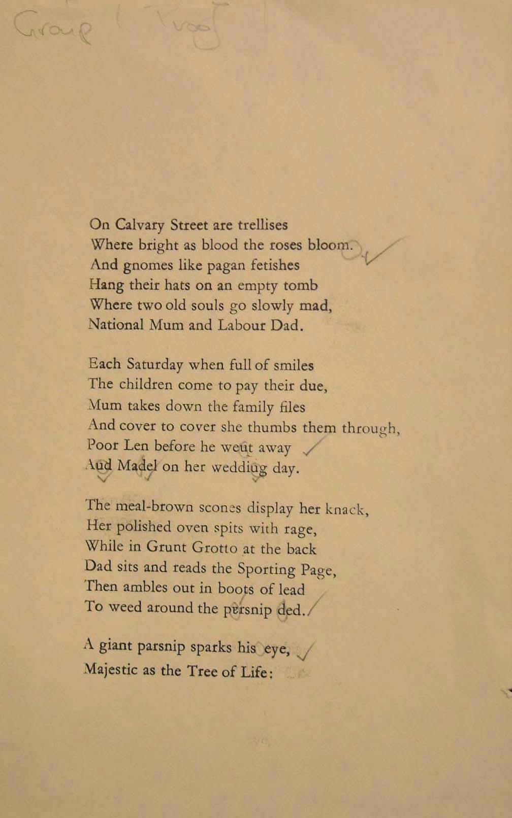 When Dr Maslen retired in 1991, his replacement in the English Department was Dr Shef Rogers, who took over the Methods and Techniques paper. He and his students continue to use the Bibliography Room, producing hand-set printing exercises. Perhaps because students will always be students, there is a sense of joyous anarchy in some of the results. They range from the amusing ‘Lest we forget’ with favourite characters, pet peeves and ambitions listed to the oppressed ‘Students of Purgatory 468’ with their A Theory Tale – in this instance a badly inked copy off the Columbian Press, where evenness of impression is hard to achieve. James K. Baxter, The Ballad of Calvary Street. Dunedin: Bibliography Room, University of Otago, 2004 |