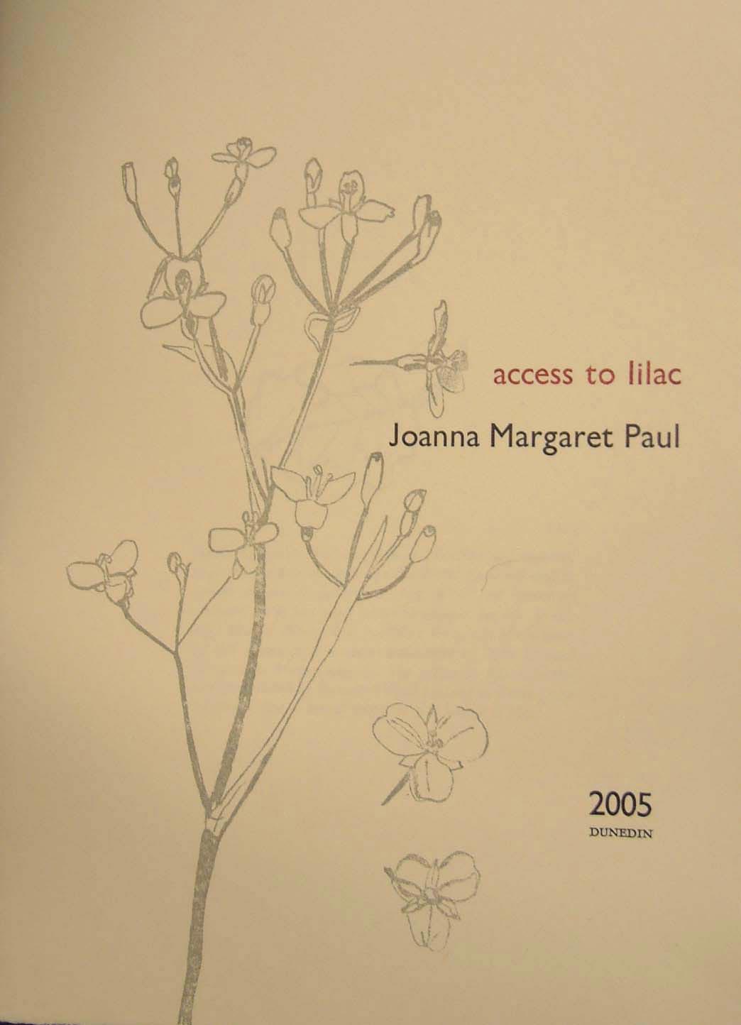 In 2005, Brendan O’Brien, a Wellington based hand-craft printer, was invited to be the third Printer in Residence. While here two projects emerged: the printing of a tribute volume of verse by the artist Joanna Paul called access to lilac; and a first time printing of Bill Manhire’s and Ralph Hotere’s PINE sequence. One hundred copies of the former were printed and available for sale; 150 copies of the latter were printed, with 100 only for sale: 26 signed and 74 unsigned copies. Hotere’s PINE is the first publication from the new Otakou Press imprint, launched successfully in December 2005. Joanna Margaret Paul, access to lilac. Dunedin: Bibliography Room, 2005 |