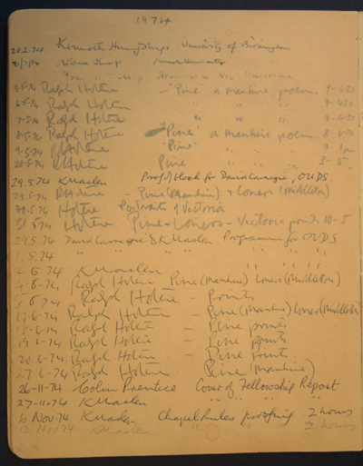 Although the Bibliography Room Register was formalized in 1967, there are some earlier entries, logged in for 1964. Visitors and users that year included Dennis McEldowney (1926-2003), writer and publisher, and brother of Jock McEldowney, the then University Librarian, Charles Brasch (1909-1973, poet and editor, Hardwicke Knight, photographer and writer, and Dr Roger Collins, University lecturer in Art History and French. Beside Collins’s name there is the note: ‘key returned. 22. 10. 64.’ Entries are still written in this book. After the exhibition ends, an archival copy will be made of the original which will ensure the survival of an important record of the Bibliography Room. Things come full circle. In 1974 Hotere used the presses to create his famous PINE sequence; in 2005 the first book form publication of PINE was completed (see cabinet 18). Bibliography Room Register 1961- |