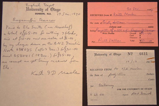 To many hand-printers, eager to get ink under their fingernails, the keeping of accounts is usually the last thing on their mind. However, in any business where more than one person and private purse is involved, book-keeping and dealing with the ephemeral scraps of paper that document such transactions, is a must. On display is a Bibliography Room account sheet for 1971-2, royalty and receipt slips, an invoice and payment for a lavish sherry party (which included glasses), and a bill to a Christchurch bookseller that was presumably written off. Royalty and stationery receipts, 1969; note on payment of blocks for Ragamuffin Scarecrow, 19 January 1970 |