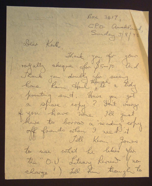 What poet today would accept 47 cents as final royalty payment? History is documented by the Bibliography Room accounts, which reveal a time when a dollar was a Dollar and the royalties paid out were relatively very small. Hone Tuwhare’s generous nature is evident in this letter to Maslen, thanking him ‘doubly for seeing Come Rain Hail through to a tidy printing end.’ Royalty note for Come Rain Hail, 1971; Hone Tuwhare to Keith Maslen, 3 September 1972 |