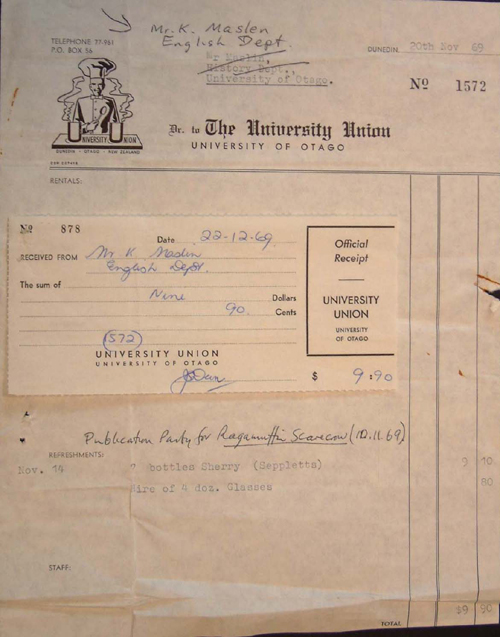 To many hand-printers, eager to get ink under their fingernails, the keeping of accounts is usually the last thing on their mind. However, in any business where more than one person and private purse is involved, book-keeping and dealing with the ephemeral scraps of paper that document such transactions, is a must. On display is a Bibliography Room account sheet for 1971-2, royalty and receipt slips, an invoice and payment for a lavish sherry party (which included glasses), and a bill to a Christchurch bookseller that was presumably written off. Invoice and receipt for a lavish Ragamuffin Scarecrow sherry party, with glasses, November 1969 |