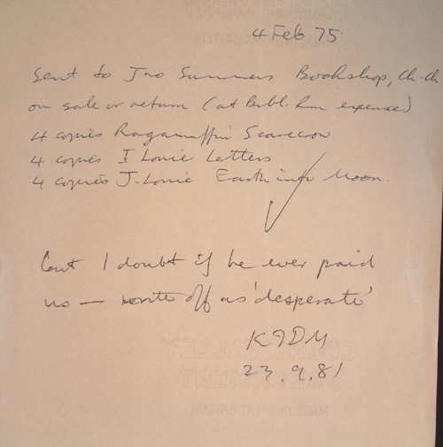 To many hand-printers, eager to get ink under their fingernails, the keeping of accounts is usually the last thing on their mind. However, in any business where more than one person and private purse is involved, book-keeping and dealing with the ephemeral scraps of paper that document such transactions, is a must. On display is a Bibliography Room account sheet for 1971-2, royalty and receipt slips, an invoice and payment for a lavish sherry party (which included glasses), and a bill to a Christchurch bookseller that was presumably written off. Note by Keith Maslen on non-payment of a bill to a Christchurch bookseller that was presumably written off, 4 February 1975; 23 September 1981 |