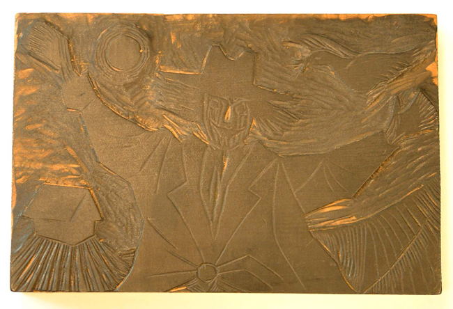 On display is one of the Ragamuffin Scarecrow blocks produced by the artist Els Noordhof. The wood from this block was from an old kauri wash tub, and was appropriately cut on the side grain. Block for Ragamuffin Scarecrow, by Els Noordhof, 1969 |