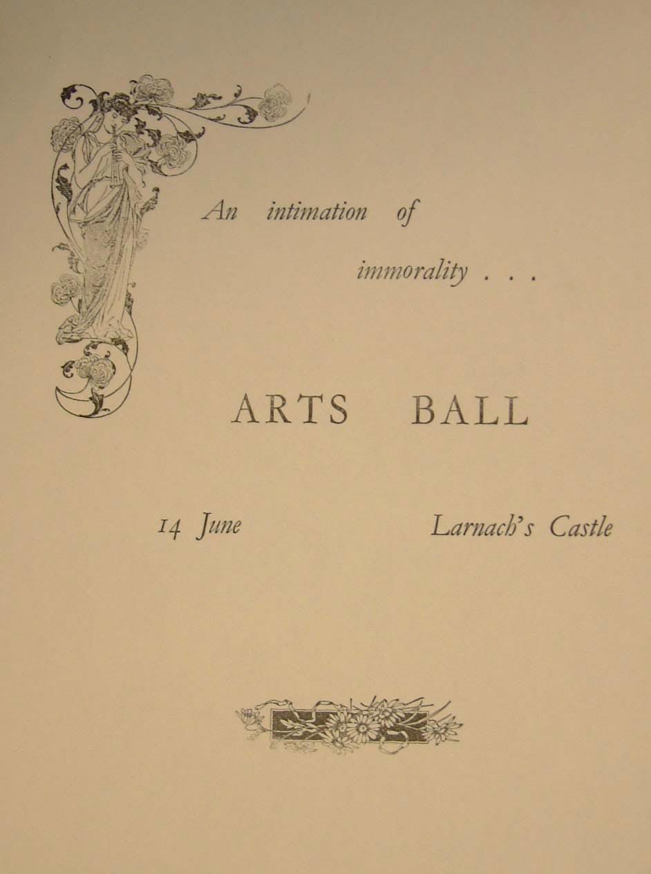 Three classes of work from the Bibliography Room presses can be distinguished: student exercises, works by New Zealand writers placed on sale (which students very often helped to produce), and pieces of jobbing printed for and by an interesting cross-section of the university community and a few outsiders. With the last, student participation has always been encouraged. Posters for student Balls (now an event of the past?) still had to convey the message, the more typographically inventively the better. Note Chris Elder’s restrained Larnach’s Castle poster of 1968 versus Bart Provo’s ‘inebriates and nymphs’ poster of 1969. Incidentally, the little flower girl block vanished long ago showing how irresistible she was in the hippy era pf the 1970s. Arts Ball poster, Larnach’s Castle, 14 June 1968 |