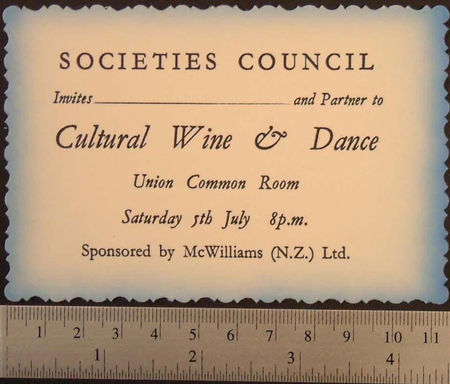 Three classes of work from the Bibliography Room presses can be distinguished: student exercises, works by New Zealand writers placed on sale (which students very often helped to produce), and pieces of jobbing printed for and by an interesting cross-section of the university community and a few outsiders. With the last, student participation has always been encouraged. Posters for student Balls (now an event of the past?) still had to convey the message, the more typographically inventively the better. Note Chris Elder’s restrained Larnach’s Castle poster of 1968 versus Bart Provo’s ‘inebriates and nymphs’ poster of 1969. Incidentally, the little flower girl block vanished long ago showing how irresistible she was in the hippy era pf the 1970s. Societies Council Cultural Wine & Dance ticket, 5 July 1969 |