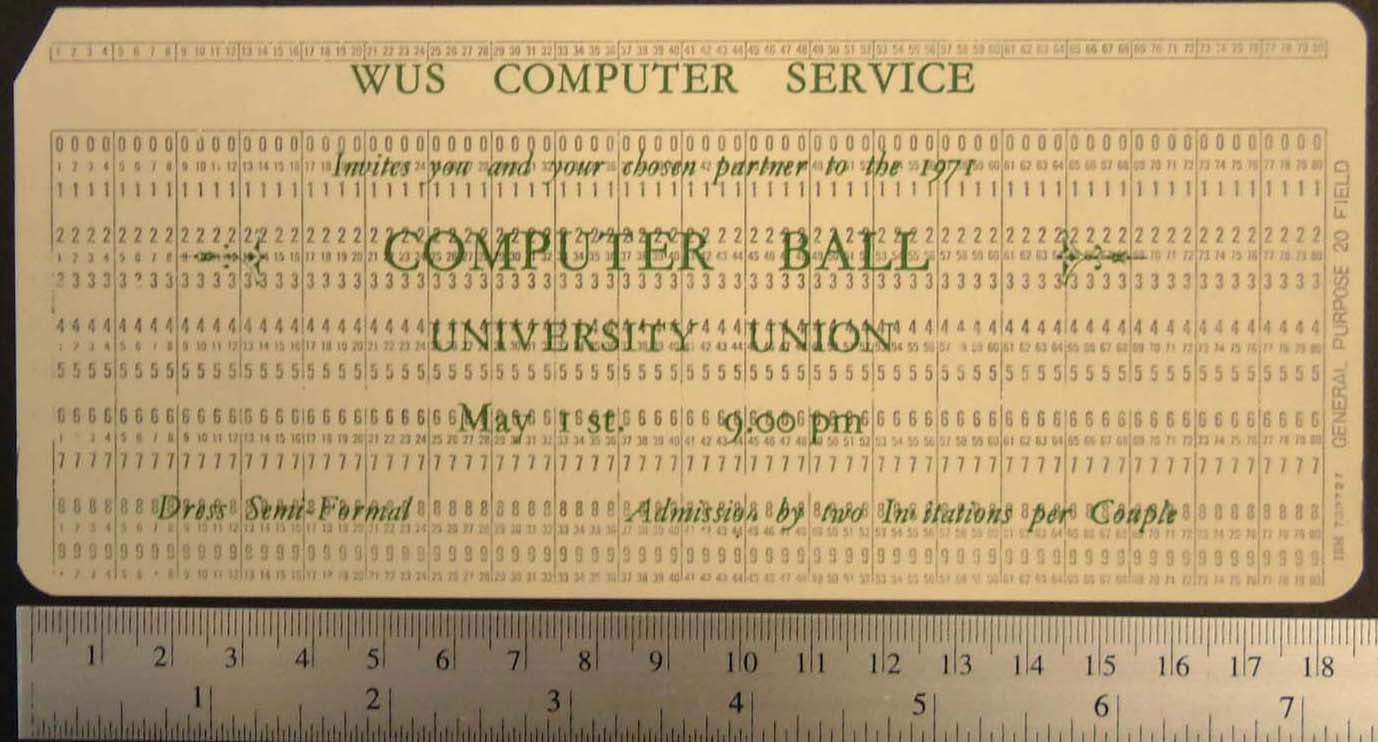 Good quality hand-made paper costs and was very hard to obtain. Again Bart Provo (then president of the Otago University Student’s Association) improvised, using old computer programming card stock for the announcement of the 1971 WUS Computer Ball. The previous year, he utilised a rather plain paper stock. A recognizable image of Denis Glover, one of New Zealand’s foremost printers, is printed on OUSSA membership tickets. He seems to be smiling at the quality productions. WUS Computer Service Computer Ball, 1 May 1971 |