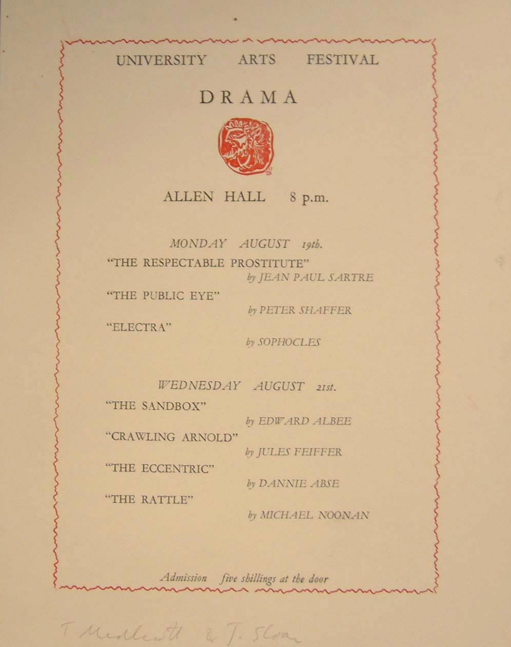However, with freedom there comes responsibilities; and the University Arts Festival Drama poster and the menu for the Classical Conference of 1963 are far more conservative outputs. Poster for the University Arts Festival, Allen Hall, 1963 |