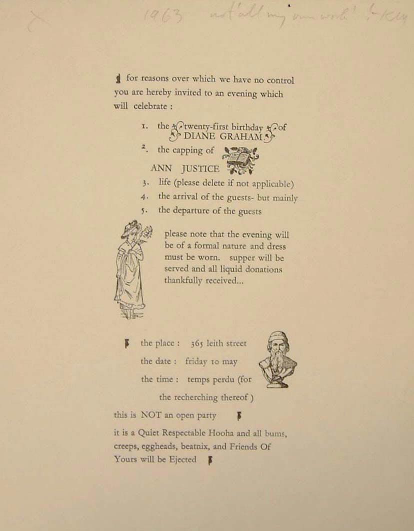 There are considerable freedoms attached to a printing press. The printer can exercise a careless regard for convention and print whatever he or she likes. It can often be amusing, for example, the 1963 party invitation announcing ‘it is a Quiet Respectable Hooha and all bums, creeps, eggheads, beatnix, and Friends of Yours will be Ejected.’ ‘A Quiet Respectable Hooha’ invitation, 365 Leith Street, 10 May 1963 |