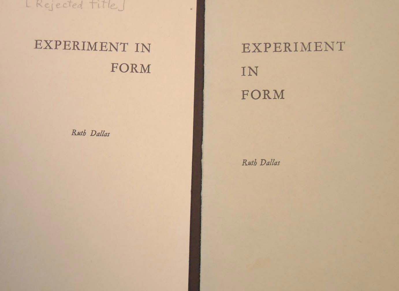 Dr Maslen, along with Don Jamieson (librarian, Medical Library), Denis McEldowney and the English honours class of 1964, created a dummy copy of Dallas’s Experiment with Form, an excellent way in which to help gauge the size of the job (12 pages) and determine such things as how much paper will be required. Below it is the end-result, showing the final layout of the poem ‘September’. Ruth Dallas was also particular about the cover of her book. Her letter to Maslen details layout trials of the cover, with a rejected version beside the final copy.