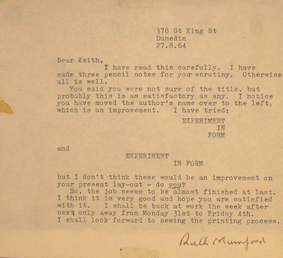Dr Maslen, along with Don Jamieson (librarian, Medical Library), Denis McEldowney and the English honours class of 1964, created a dummy copy (upper left) of Dallas’s Experiment with Form, an excellent way in which to help gauge the size of the job (12 pages) and determine such things as how much paper will be required. Below it is the end-result, showing the final layout of the poem ‘September’. Ruth Dallas was also particular about the cover of her book. Her letter to Maslen details layout trials of the cover, with a rejected version beside the final copy. Ruth Mumford [Dallas] to Keith Maslen, 27 August 1964 |