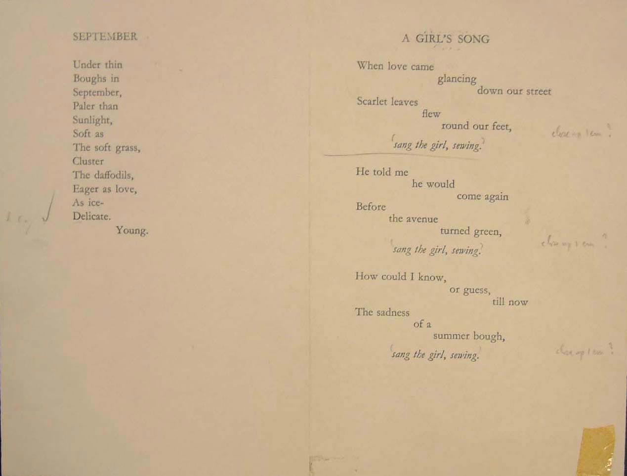Ruth Dallas’s Experiment in Form shows some of the intricacies involved in the printing of a book. On display is her first typescript version of the poem ‘September’, a first proof copy with a note asking for a lower-case ‘d’ in the word ‘delicate’, and the author’s revision of the proof with changes involving line indentations. The print process can be long, as in this instance of having to make adjustments to meet the author’s aesthetic requirements as well as facing the physicality of setting individual type, the allowance for spacing, and the all-important layout. The latter, like good inking, is one of the secrets of success in hand-printing. Layout proof of two poems from Experiment in Form, 1964 |
