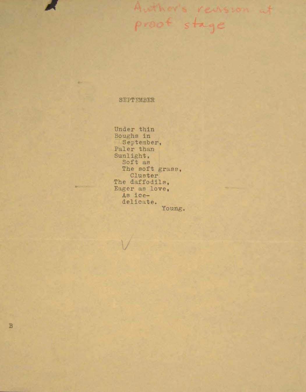 Ruth Dallas’s Experiment in Form shows some of the intricacies involved in the printing of a book. On display is her first typescript version of the poem ‘September’, a first proof copy with a note asking for a lower-case ‘d’ in the word ‘delicate’, and the author’s revision of the proof with changes involving line indentations. The print process can be long, as in this instance of having to make adjustments to meet the author’s aesthetic requirements as well as facing the physicality of setting individual type, the allowance for spacing, and the all-important layout. The latter, like good inking, is one of the secrets of success in hand-printing. Revision of ‘September’, 1964 |