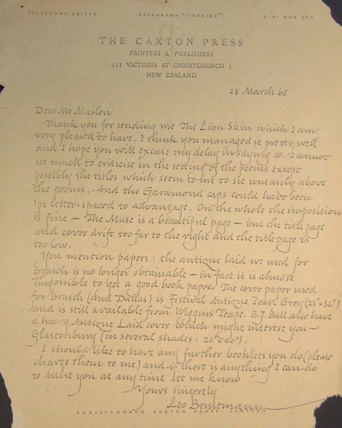 The publications from the Bibliography Room have always formed part of an important outreach programme, and by sending them to individuals and institutions in New Zealand and overseas, they highlight the Room’s on-going activities. Such networking is vital. Over the years, recipients have included the Bodleian Library, the British Museum (Library), the Huntington Library (California), the Hocken, the Turnbull Library, the Harvard Library, and as displayed, the National Collection of Fine Arts at the Smithsonian Institution. Notable individual recipients have included the late Don MacKenzie, bibliographers Graham Pollard and Philip Gaskell, and American scholars James Osborn and Gordon Ray. Leo Bensemann, from The Caxton Press, was but one local supporter. As a designer par excellence, he had every right to make comment on the final copy. Leo Bensemann to Keith Maslen, 28 March 1968 |