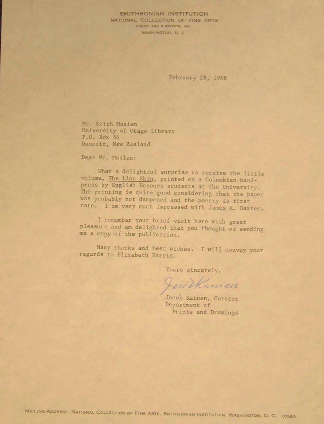 The publications from the Bibliography Room have always formed part of an important outreach programme, and by sending them to individuals and institutions in New Zealand and overseas, they highlight the Room’s on-going activities. Such networking is vital. Over the years, recipients have included the Bodleian Library, the British Museum (Library), the Huntington Library (California), the Hocken, the Turnbull Library, the Harvard Library, and as displayed, the National Collection of Fine Arts at the Smithsonian Institution. Notable individual recipients have included the late Don MacKenzie, bibliographers Graham Pollard and Philip Gaskell, and American scholars James Osborn and Gordon Ray. Leo Bensemann, from The Caxton Press, was but one local supporter. As a designer par excellence, he had every right to make comment on the final copy. Jacob Kainen to Keith Maslen, 29 February 1968 |