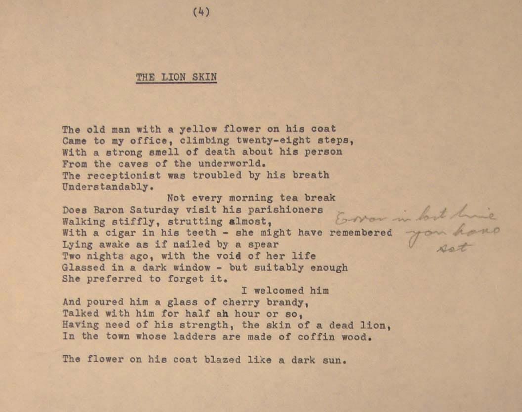 In 1967, James K Baxter returned for a second year as Burns Fellow at the University of Otago. While he was here, Dr Maslen printed an edition of 240 copies of Baxter’s The Lion Skin, priced to sell at 75 cents each. While type-setting the book, Maslen had propped up in front of him a copy of Joseph Moxon’s Mechanick Exercises on the Whole Art of Printing, published serially 1683-84. This publication, one of the earliest European manuals of printing, enabled Maslen to compare 20th-century Bibliography Room practices with those best practices in Moxon’s day. Here is Baxter’s typescript poem of ‘The Lion Skin’ and an early proof copy. James K. Baxter, typescript of ‘The Lion Skin’, 1967 |