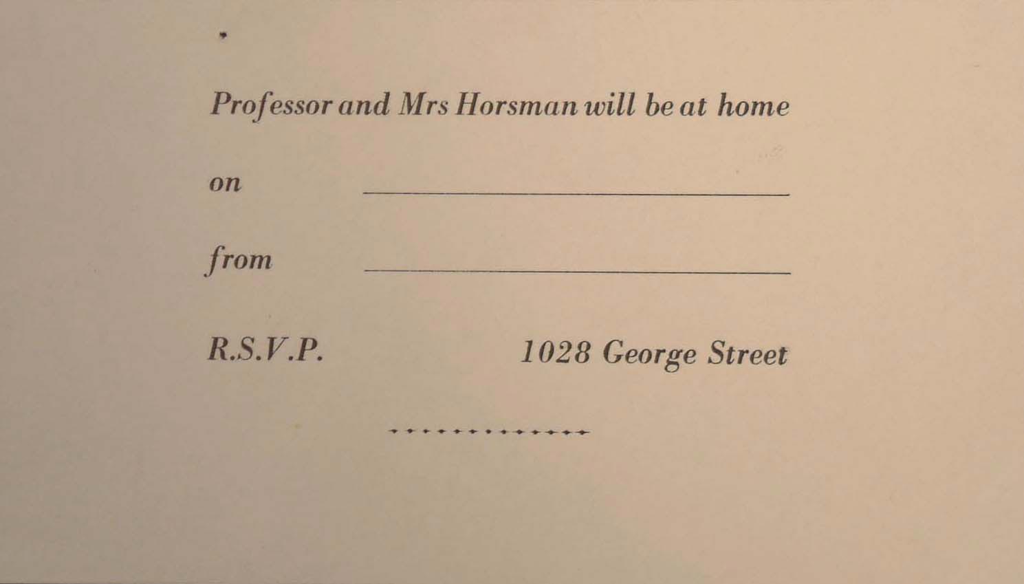 They don’t make conference packs like they use to do, nor do lecturers advertise their availability at home anymore – and in such a distinctive manner. These two items and the ‘Merry Christmas’ and ‘QSL 4XT Radio Randi’ form a small part of the many ephemeral (from the Latin and Greek meaning ‘lasting only a day’) pieces printed on the presses since 1961. While one poster or ticket is seen as having little or no value, the cumulative amassing of such things often gains in importance, especially as social documents of a time and place. This certainly applies to the outputs from the Bibliography Room presses. ‘Professor and Mrs Horsman will be at home’, 1962 |