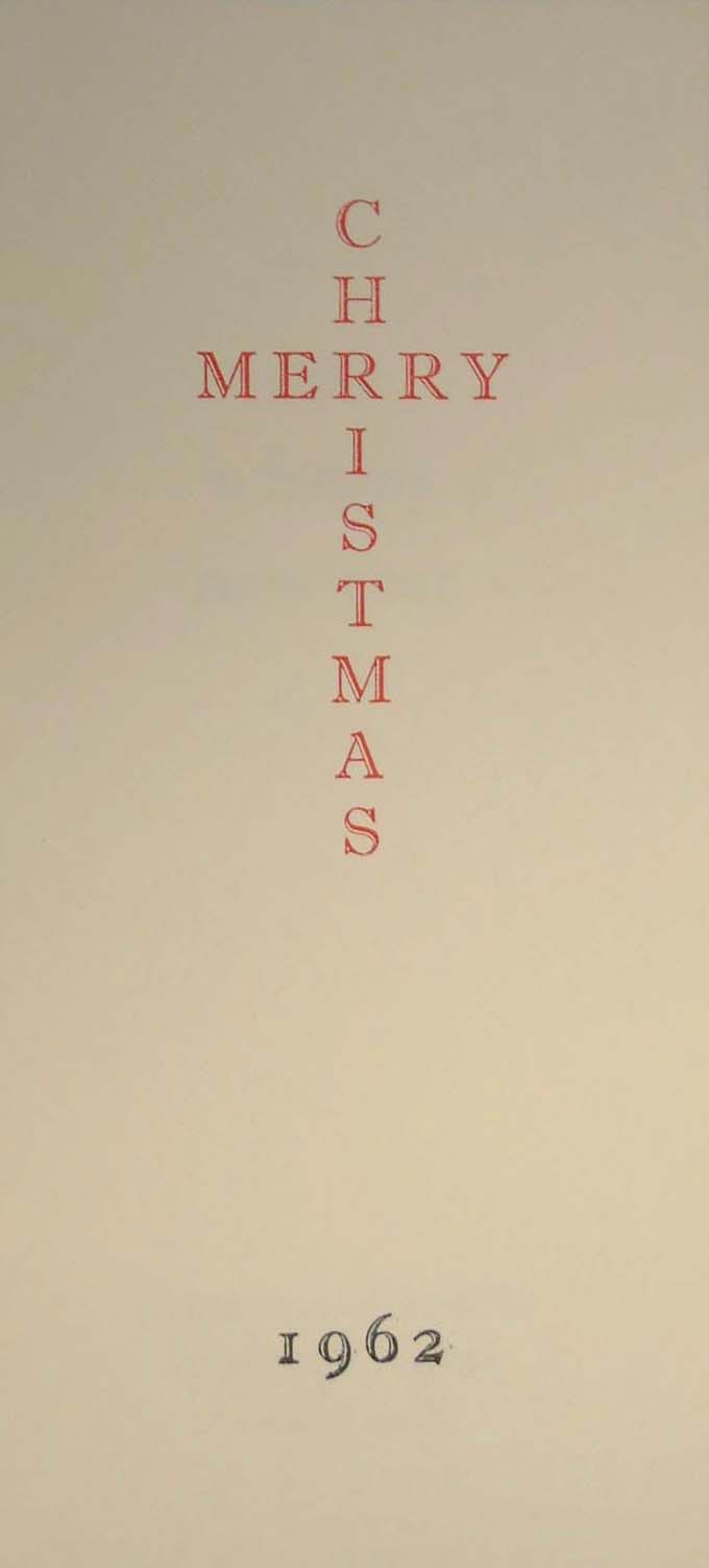 They don’t make conference packs like they use to do, nor do lecturers advertise their availability at home anymore – and in such a distinctive manner. These two items and the ‘Merry Christmas’ and ‘QSL 4XT Radio Randi’ form a small part of the many ephemeral (from the Latin and Greek meaning ‘lasting only a day’) pieces printed on the presses since 1961. While one poster or ticket is seen as having little or no value, the cumulative amassing of such things often gains in importance, especially as social documents of a time and place. This certainly applies to the outputs from the Bibliography Room presses. Merry Christmas, 1962 |