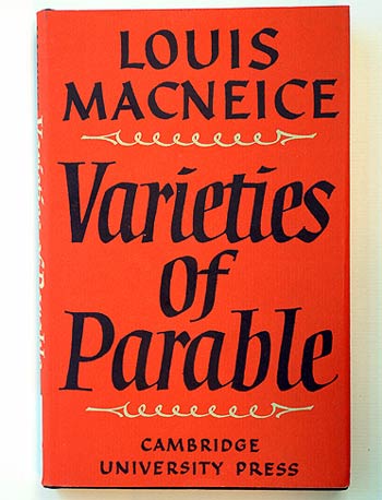 The most economical and by no means the least effective cover for a book is the typographical jacket. In the confined canvas, there can be a variety of typefaces used, with decorative borders also used to heighten the effect. One design rule is clear: there must be a sense of balance and proportion. Here Will Carter (1912-2001), the founder of the Rampant Lion Press (Cambridge) and well-known printer and designer, has used his calligraphic skills to great effect on MacNeice's work published by the Cambridge University Press.