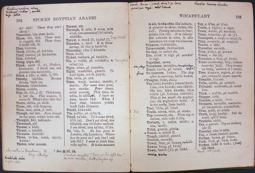 Before going out to Egypt, Brasch took courses in the language at the School of Oriental Studies in London. His tiny script is evident in this Egyptian Arabic manual, with English words such as 'thickness', 'thigh' and 'tortoise' written with their Egyptian Arabic equivalents, and phrases such as 'put out your tongue' and 'have you the right time?' To further prepare himself, he read much on Egyptian history and even as late as October 1953, he wanted to 'steep himself again' in Egypt. Brasch was at Tell el-Amarna when the head of Queen Nefertiti was unveiled.