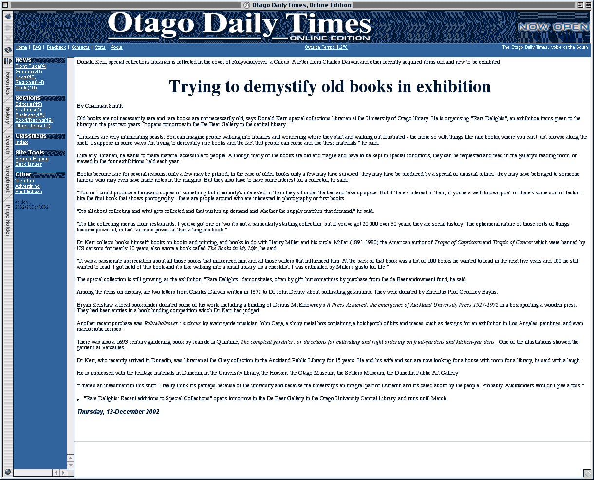 Darwin and Borromini, just two rare delightsThe rare book collection in Special Collections, University of Otago Library, is by no means a static one. It continues to grow through purchase and donation. By way of thanking donors for their kind gifts and showcasing new acquisitions, an exhibition called Rare Delights will start on 13 December 2002 at Special Collections at the University of Otago Library. The exhibition will feature recent additions to the collection since 1998. New acquisitions range in topic from garden history and architecture to 18th century literature and works by the English poet Robert Graves. These build on strengths from the de Beer, the Iolo Williams, and the University's own collections. Other books have been purchased because of their historical significance or because they fill gaps in the existing collection. Over the past four years, donors have gifted books to the collection. These books supplement the collection's strengths and also represent new and potential fields for additional collecting. Specific items of interest include the large first edition of Francesco Borromini's Opera, a work displaying his designs of the church of La Sapienza in Rome (1720), an English edition of Jean de la Quintinie's The Compleat Gard'ner (1693), the herbalist Nicholas Culpeper's London Dispensatory (1695), and John Hall-Stevenson's macabre Makarony Fables (1768). Other highlights include Humphry Repton's Observations on the theory and practice of landscape gardening (1803), two original letters written by Charles Darwin, John Cage's avant-garde Rolywholyover (1993), and samples of hand press work from Tara McLeod's The Pear Tree Press.