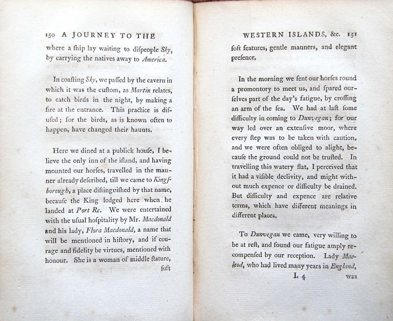 In between noting the depopulation of the Highlands, and the propensity of the Scots to drink whisky (skalk) before breakfast, Johnson met Flora MacDonald, famous for rescuing Bonnie Prince Charlie after the 1745 Rebellion. Written on her gravestone is the Johnsonian sentence (p. 150):