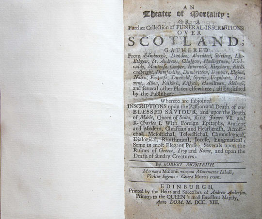 Robert Monteith, An Theater of Mortality, or, A Further Collection of Funeral-inscriptions over Scotland. Edinburgh: Printed by the heirs and successors of Andrew Anderson, 1713.
