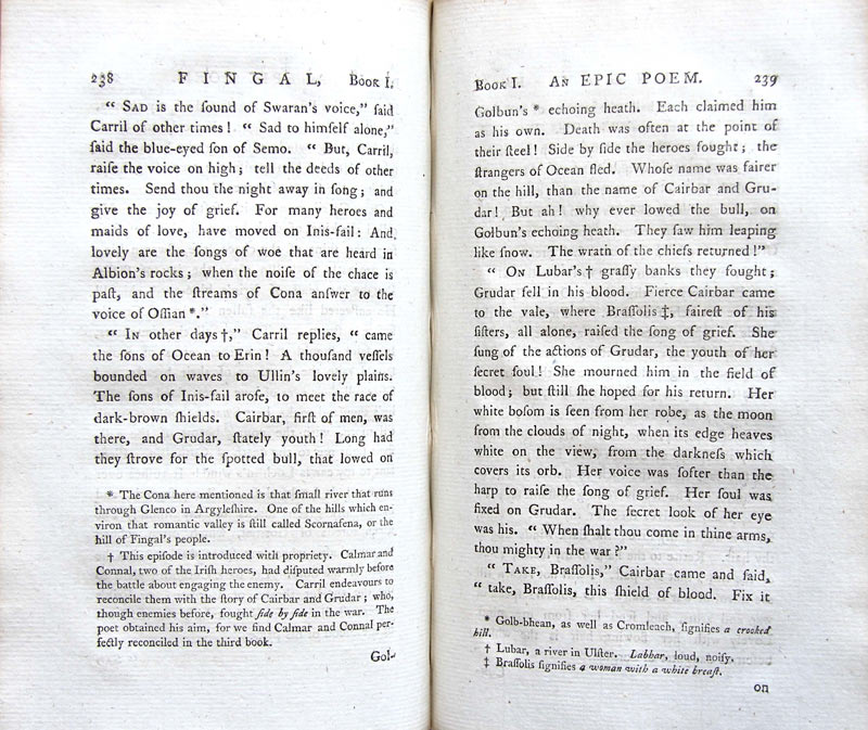 In 1760, James Macpherson published Fragments of Ancient Poetry, Collected in the Highlands of Scotland, and Translated from the Gaelic or Erse language.