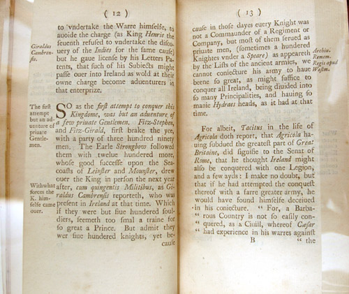 Sir John Davies (1569-1626) asked in his A Discoverie of the True Causes Why Ireland Was Neuer Entirely Subdued (1612), 'why this Kingdome' [Ireland] was not 'thoroughly subdued and reduced to Obedience of the Crowne of England.' This was a naïve question given the complexities of Ireland and the Irish. Davies's position as Attorney General was made more difficult by his staunch desire to expel Catholic priests from Ireland, and to establish a system of law based on land rather than blood. This 1747 reprint of Davies's work details the naïve attitude of another: Agricola, who believed that Ireland could be conquered by one legion, and in only a few days.