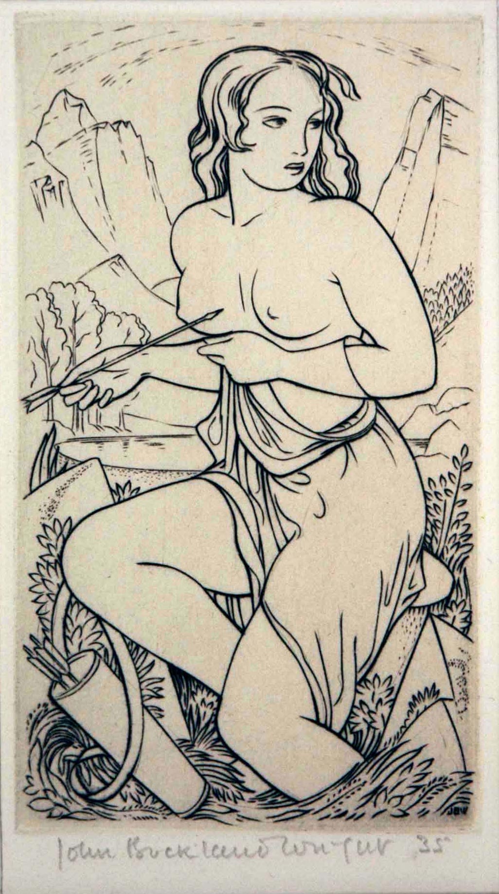 By the early 1930's, JBW's reputation as an artist was well-known, especially in European circles. Although commissioned work continued to arrive, he explored self-publishing, as a way in which he could remain in control of both subject and treatment. Cupid's Pastime was produced as a limited edition of 31 copies in 1935 under the imprint of 'J.B.W. Editions.' A note in the colophon reads: 'a private experiment in illustration and typography by the engraver of the plates, who offers no other excuse for this publication.' There is a timeless quality to what is an exquisitely executed engraving. 'Girl or Nymph with arrow', in Cupid's Pastime. Printed by A. A. M. Stols for J.B.W., 1935. Dunedin Public Art Gallery. No. 108-1993. |