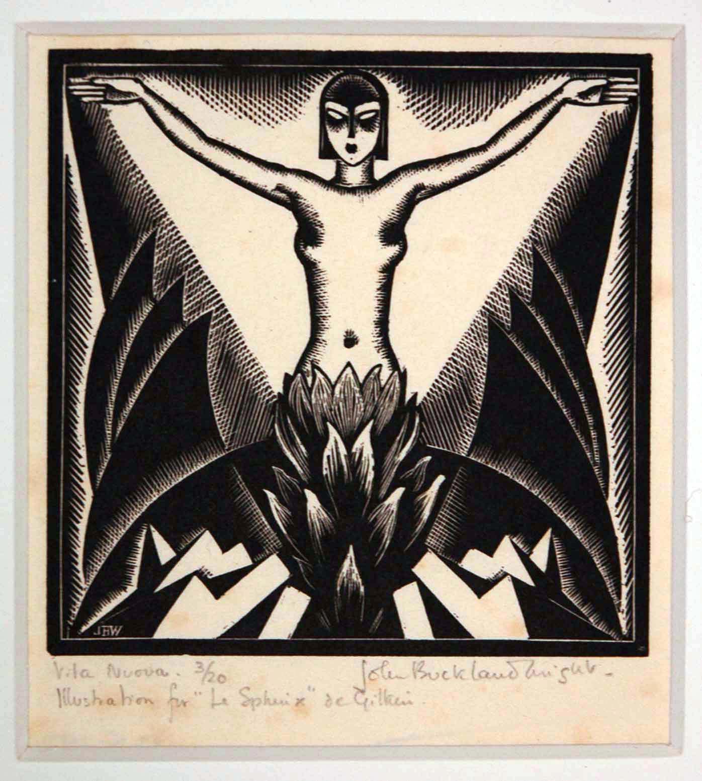 The fourteen wood engravings in Iwan Gilkin's Le Sphinx are of particular importance because they represent JBW's first book illustrations. They were created in 1928, well before his engravings for Keats's Sonnets (1930), but not published in their entirety until issued as a gift to members of Graphia in 1960. Illustration from Iwan Gilkin, Le Sphinx. Antwerp: Graphia, 1928. Dunedin Public Art Gallery. No. 125-1970. |