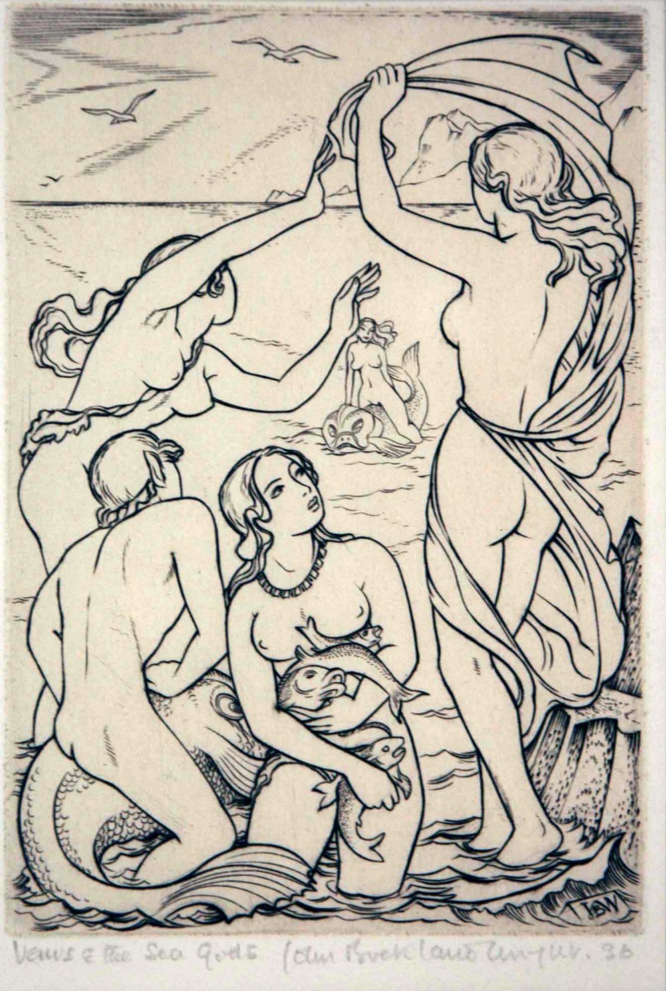The second 'J.B.W.' publication was The Marriage of Cupid and Psyches [sic], which appeared in 1936. In a colophon note not used, JBW stated that the engravings were printed by himself using a special ink made from a recipe of Joseph Hecht's which was itself based on fifteenth century formulas. The war put an end to any further 'JBW' experiments. 'Venus summoning the sea-gods' is one of ten copper engravings in the book. 'Venus summoning the sea-gods' from The Most Pleasant and Delectable Tale of the Marriage of Cupid and Psyches [sic]. Printed by J. Enschedé en Zonen, Haarlem, for J.B.W. Editions, 1936. Dunedin Public Art Gallery. No. 120-1993. |
