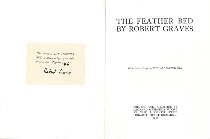 Poems that did not make it formed The Feather Bed, a work that Graves felt ‘represents a particular variety of liquefaction.’ Produced by the Woolf’s Hogarth Press, this limited edition volume sold out.