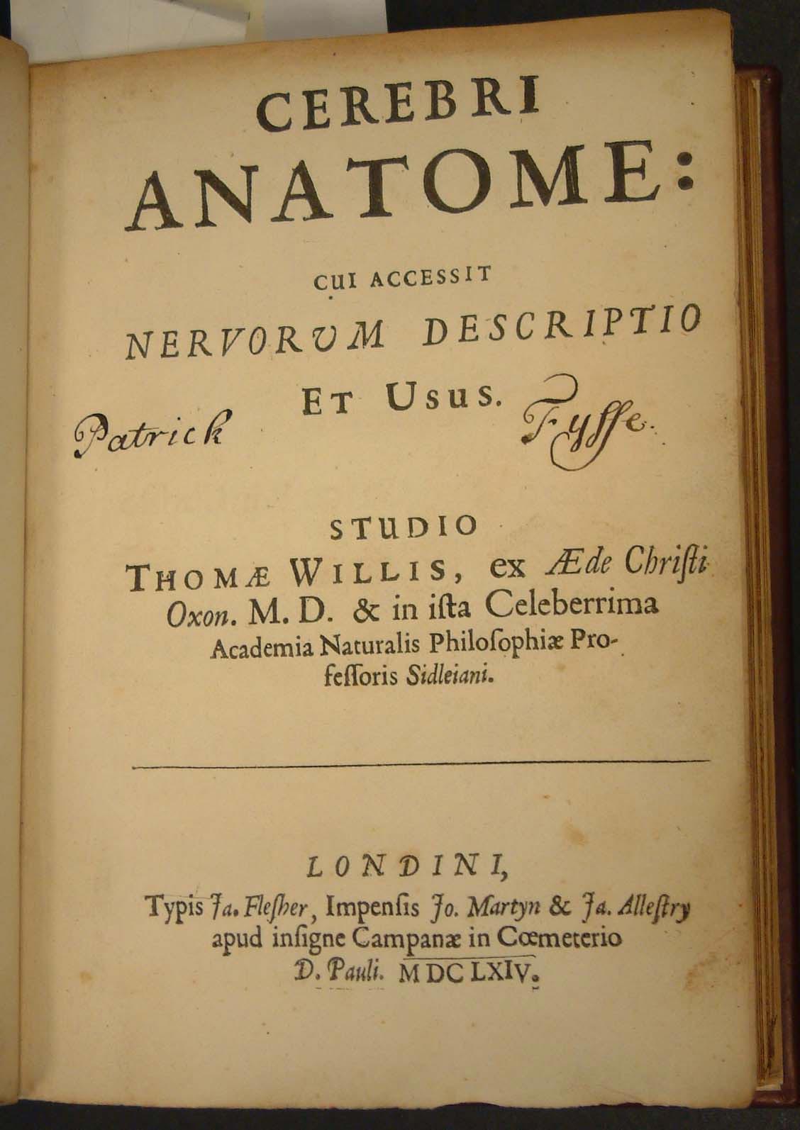 Thomas Willis, Cerebri anatome: cui accessit nervorum descriptio et usus. London: James Flesher, Joseph Martyn and James Allestry, 1664.