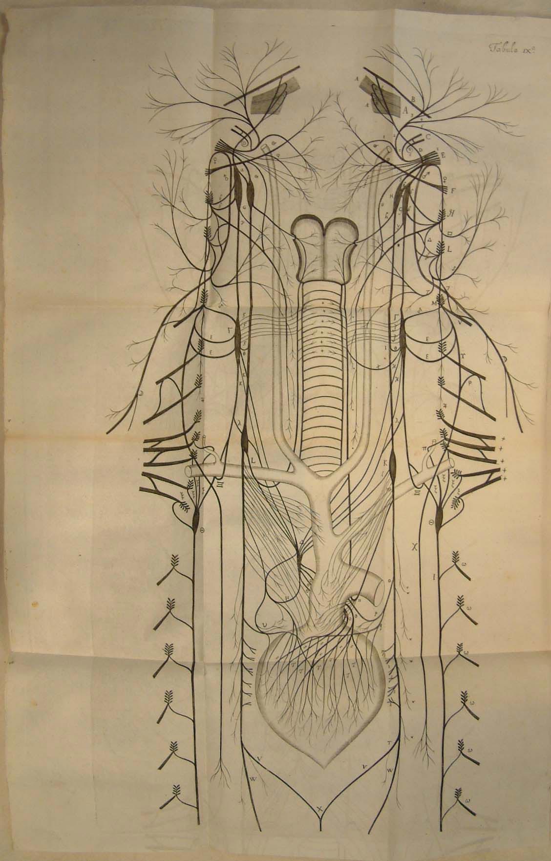 The Anatomy of the Brain with a Description of the Nerves and their Function (1664) by the British physician Thomas Willis (1621-1675) is one of the older items in the Monro Collection, and was an extremely valuable resource on the nervous system for the Monros. This illustration of the veins and arteries without the body showing is exquisitely artful and organic. This is the first edition.