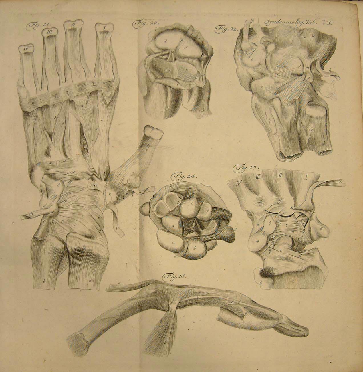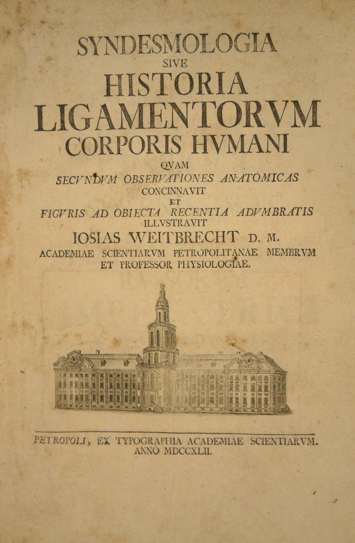 Josias Weitbrecht, Syndesmologia sive, Historia ligamentorvm corporis hvmani qvam secvndvm observationes anatomicas concinnavit et figvris ad obiecta recentia advmbratis illvstravit Iosias Weitbrecht. Petropoli [St. Petersburg]: Academiae Scientiarum, 1742.