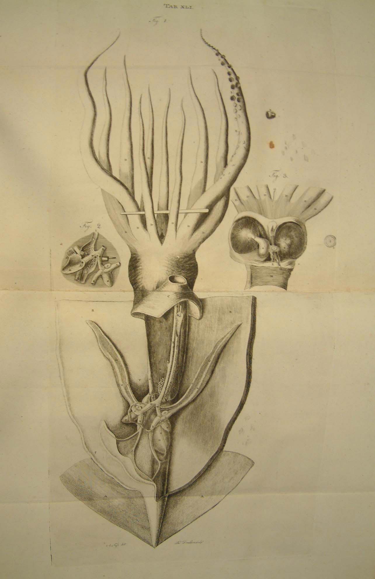 As a good anatomist, Secundus did not restrict his teaching and learning to the human body alone. The Structure and Physiology of Fishes (right) is a stunning text with many illustrations in fine detail. The specimen on display is a cuttlefish.