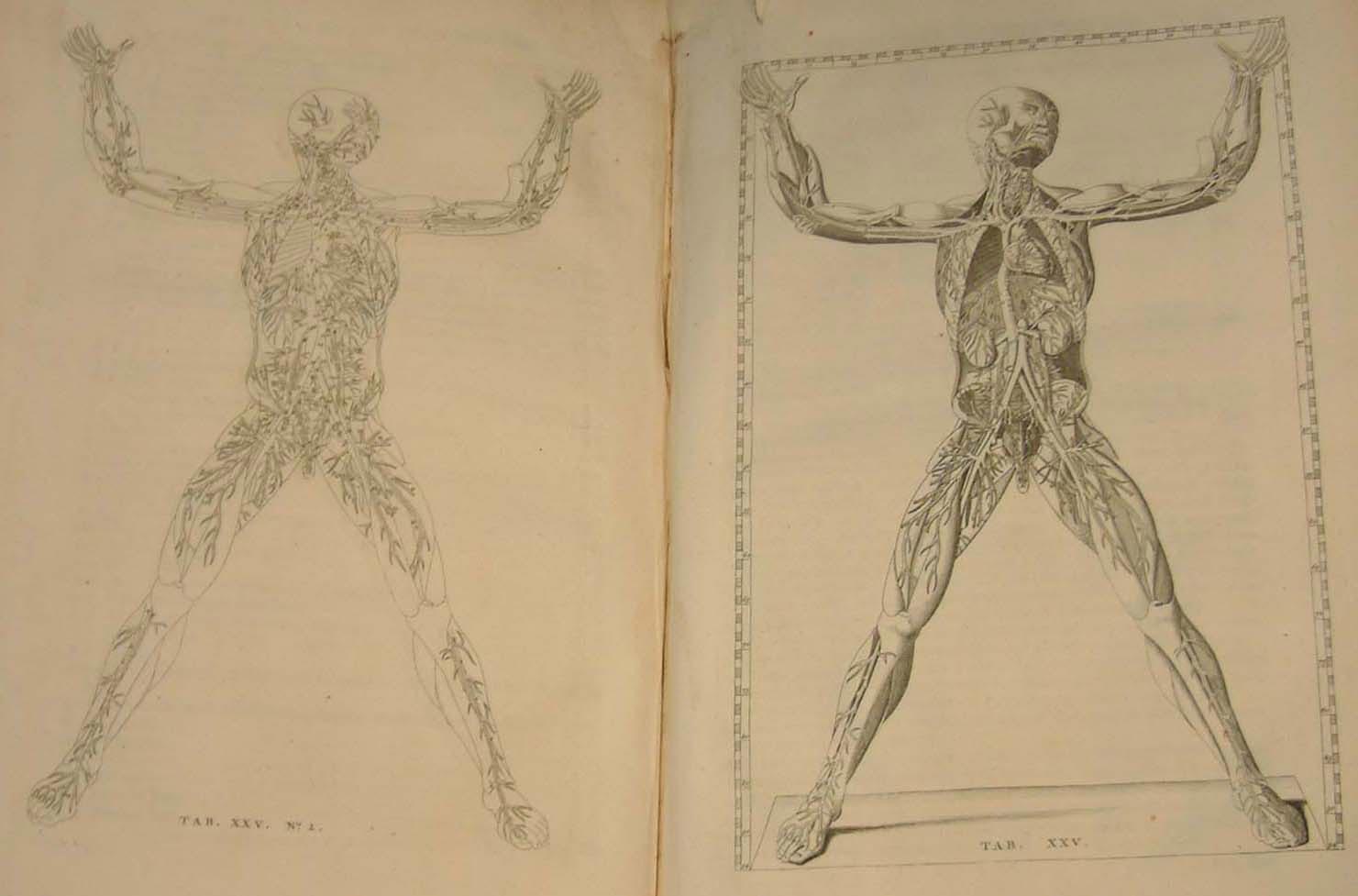 Bartolomeo Eustachius (d. 1574) discovered the Eustachian tube, the thoracic duct, the adrenals and the abducens nerve. He also gave the first accurate description of the uterus and described the cochlea, throat muscles and origin of the optic nerves. Although Eustachius actually completed his work in 1552, it was lost, then re-discovered in the Vatican Library and first printed in 1714. In 1744, B. S. Albinus published the third printing of the anatomical Tables of Eustachius. Eustachius dissected bodies with the greatest care and diligence, and was conscious about presenting just views of the shape, size and relative position of the organs of the human body. The etching in this first Albinus edition certainly displays Eustachius' superb craft.