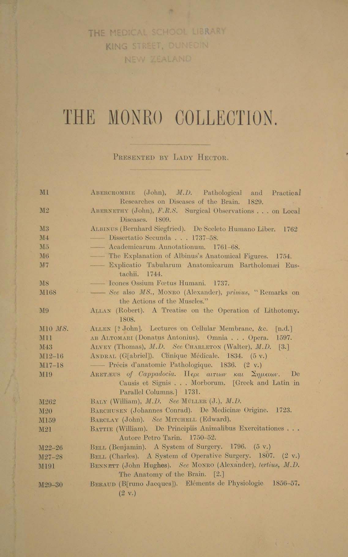 When the Monro Collection arrived at the University of Otago in 1929, it was accompanied with this catalogue, which had been compiled by staff at the General Assembly Library in Wellington, where it is said the Collection had resided since 1907. The story of how the Collection came to be here at Otago is dusted with intrigue and lost details, but it is clear that it originally came to New Zealand with David Monro. David was the younger of two medically qualified sons of Tertius, and was better known in New Zealand as a Speaker in the House of Representatives in 1861. On his death, the Collection was bequeathed to David's son-in-law Sir James Hector Monro. It was James' son Dr Charles Monro Hector, an Otago medical graduate, who was instrumental in transferring the Collection from the General Assembly Library to the Otago Medical School. This document forms the basis of the current arrangement of the Collection in the Medical Library.
