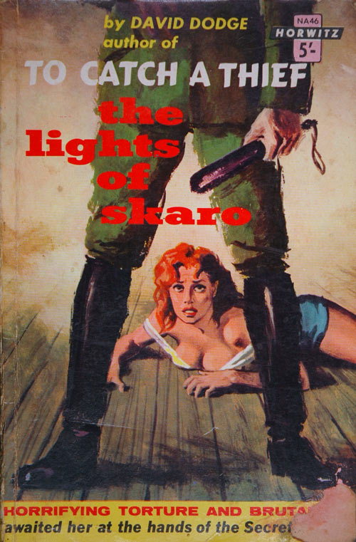 American thriller writer David Francis Dodge (1910-1974) wrote the very successful To Catch a Thief. After buying in his novel, The Lights of Skaro, Horwitz made use of the previous title (somewhat confusingly) to entice potential buyers. Their cover is markedly unlike the first edition British one in that it depicts a member of the Secret Police in the People’s Free Federal Republic menacing Cora Lambert, ‘a high-voltage American newspaper woman’ (blurb).