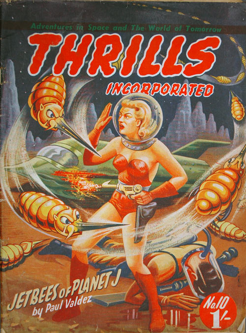 Between 1950 and 1952, Horwitz published Thrills Incorporated, Australia’s first science-fiction magazine, and their success enabled them to survive the lifting of import restrictions in 1958, which put a lot of smaller business out of action. This issue promotes Jetbees of Planet J by Paul Valdez, who was in fact Alan Yates, a PR officer for Qantas.